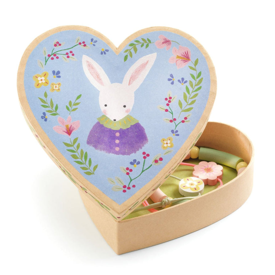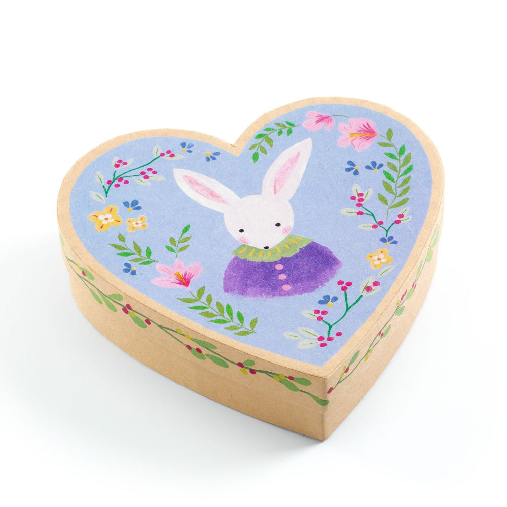 Je eigen DJECO sieradendoosje met 3 houten armbandjes. Het doosje is versierd met een schattig konijntje en bloemetjes. Berg al je schatten op in het sieradendoosje en maak je outfit helemaal af met de groene en roze armbandjes!