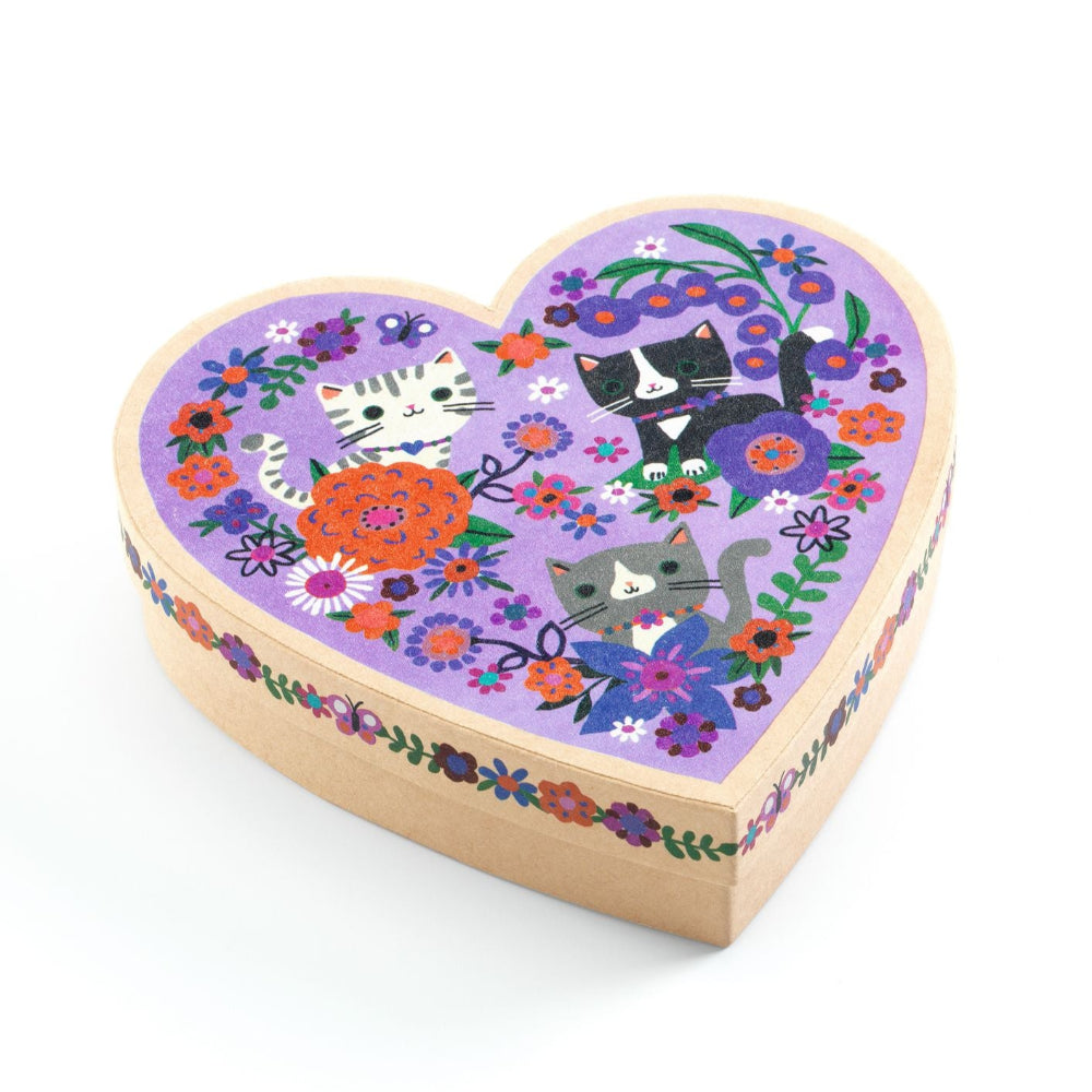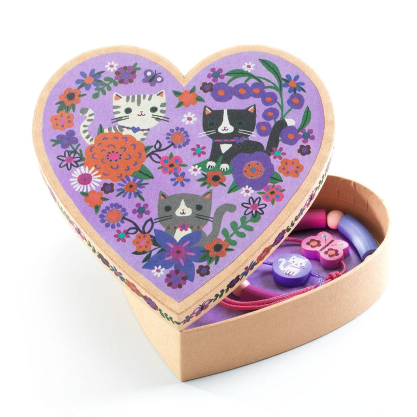 Je eigen Djeco sieraden doosje met 3 mooie houten armbandjes. Het doosje is versierd met schattige katjes, vlinders en bloemen. Berg al je schatten op in het sieradendoosje en maak je outfit helemaal af met de paarse armbandjes!
