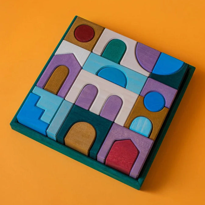 De small building floors bestaat uit 26 houten blokken in verschillende kleuren van donkergroen, tot blauw en lila tinten, verschillende vormen en groottes. Laat je fantasie de vrije loop en maak de meest fantastische huizen, torens of probeer alle blokjes weer in de meegeleverde vorm te krijgen.