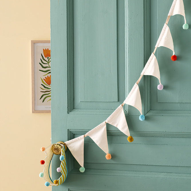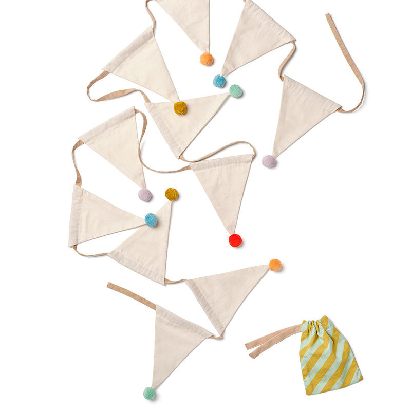 Kids Concept vlaggetjes slinger, een vrolijke decoratie voor de verjaardag van je kind met 11 vlaggetjes in een gebroken witte kleur. Onderaan ieder vlaggetje hangt een gekleurde pompon. De vrolijke slinger zorgt voor een feestelijk accent.