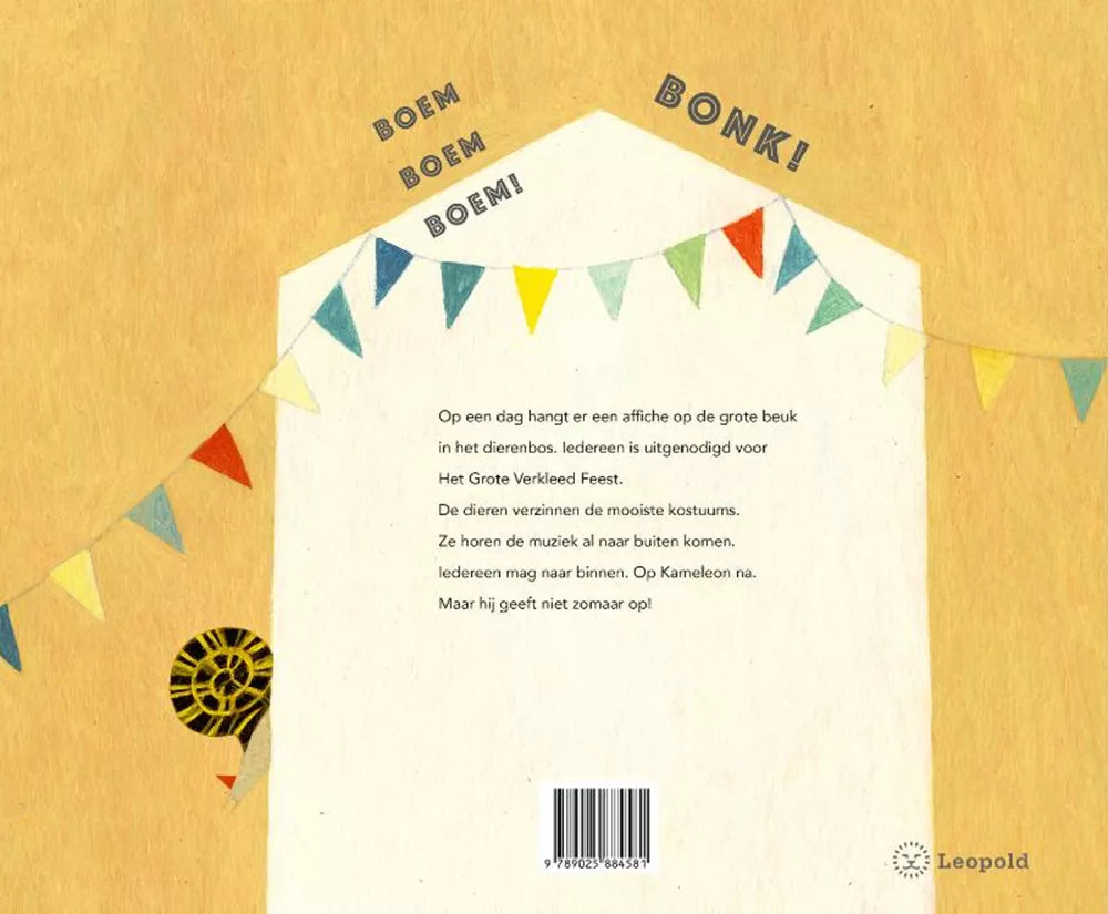 Het bos staat op zijn kop: er komt een groot feest aan! Alle dieren hebben zich prachtig verkleed en sluiten enthousiast aan in de lange rij voor de ingang. Iedereen mag naar binnen, behalve Kameleon. Wat hij ook probeert, niemand lijkt hem te zien. Tot hij ineens wel welkom is. Maar eenmaal binnen vindt hij het feest veel te wild en overweldigend. Kameleon gaat op zoek naar een uitweg en tot zijn verrassing komt hij daar iemand tegen.