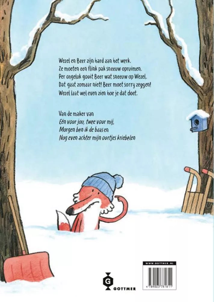 Wezel en Beer zijn samen sneeuw aan het schuiven. Dat gaat prima, totdat Beer per ongeluk een flinke schep sneeuw over Wezel heen gooit. Wezel irriteert zich dat Beer geen sorry zegt. Maar excuses aanbieden blijkt moeilijker dan gedacht voor Beer. Beiden willen ze hun gelijk krijgen. Terwijl de irritatie oploopt, leren de twee vrienden dat eerlijk zijn, luisteren en goedmaken uiteindelijk veel fijner is dan boos blijven.