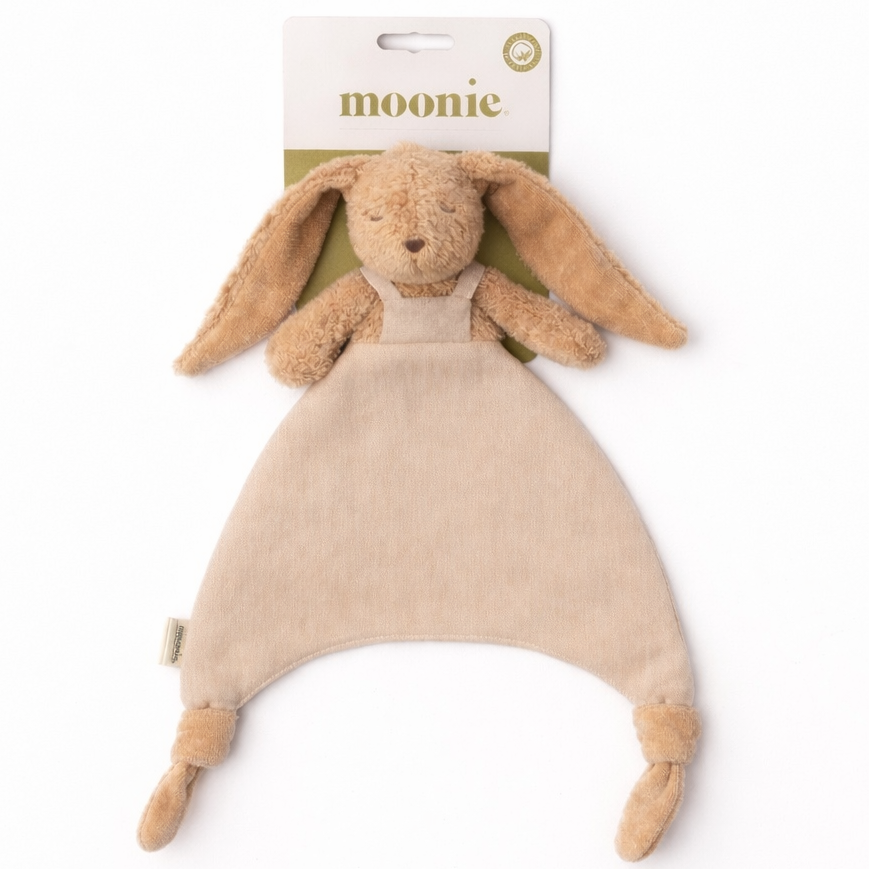 Moonie knuffeldoekje doudou bunny cappuccino is geschikt voor baby's vanaf 0 maanden, het doekje is gemaakt van teddy gemaakt van biologische katoen en een linnen lijfje. Met de handwassen of op een koud wol-fijnwasprogramma.