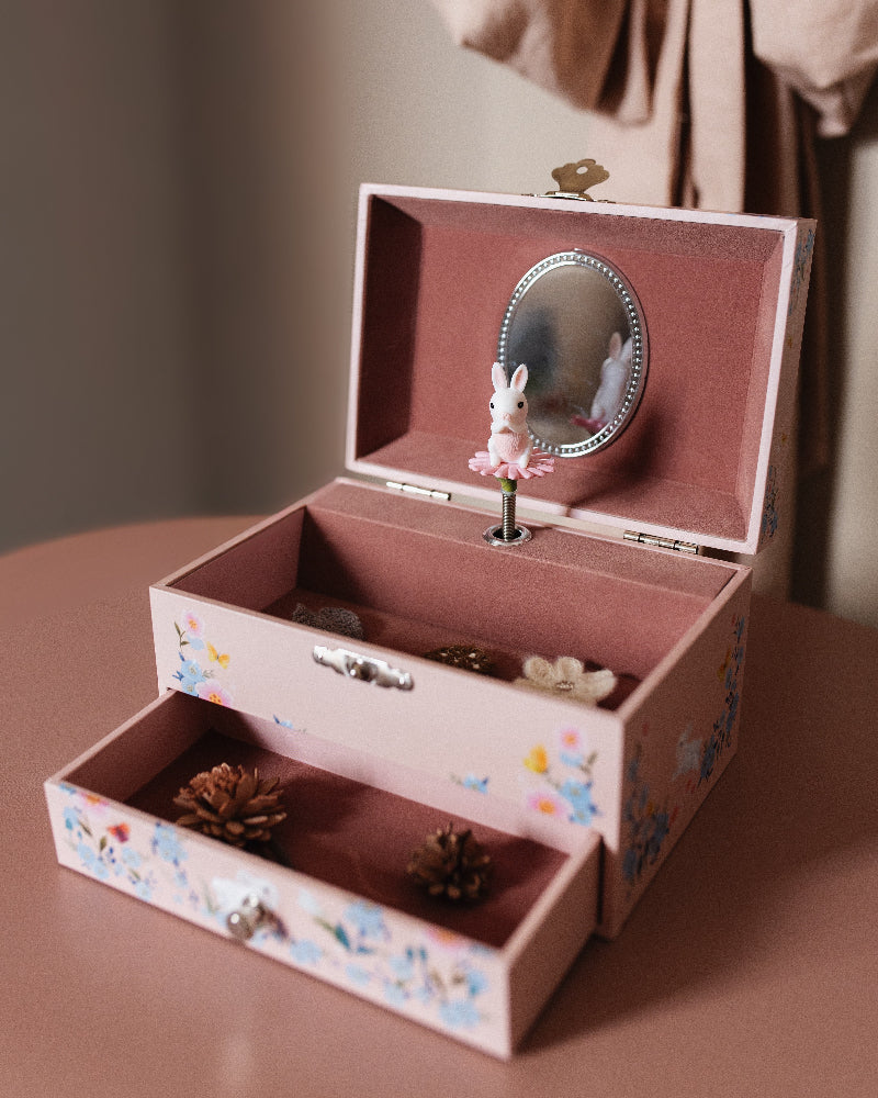 Aan de buitenkant van de bijoux doos zie je een sprookjesachtige bunny en heel veel bloemen op een roze achtergrond. Geïllustreerd door Kendra Binney. Open de deksel en het konijntje komt tevoorschijn op een roze bloem. De muziekdoos heeft een laatje, hierin bewaar je nog meer moois.