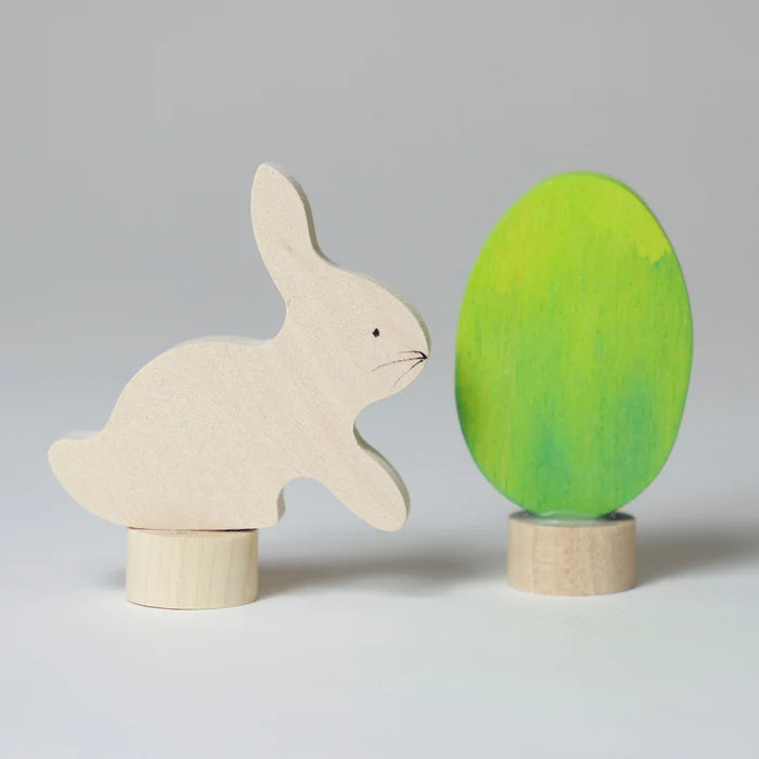 GRIMMS Pasen steker set voor een jaarring, het konijn en het groene paasei fleuren jouw celebration ring helemaal op en passen perfect in het voorjaar lente thema. De houten steekfiguren passen op alle GRIMMS jaarringen.