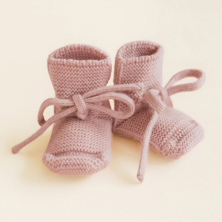 De babyslofjes zijn gebreid in 100% merino in ribbel knit samen zorgen zij voor extra elasticiteit en rekbaarheid  zonder de vorm van de slofjes te verliezen. De baby booties hebben een echte hielvorm, dit zorgt voor een goede pasvorm.  Ze blijven goed aan het voetje zitten door de gebreide veter die kan strikken.