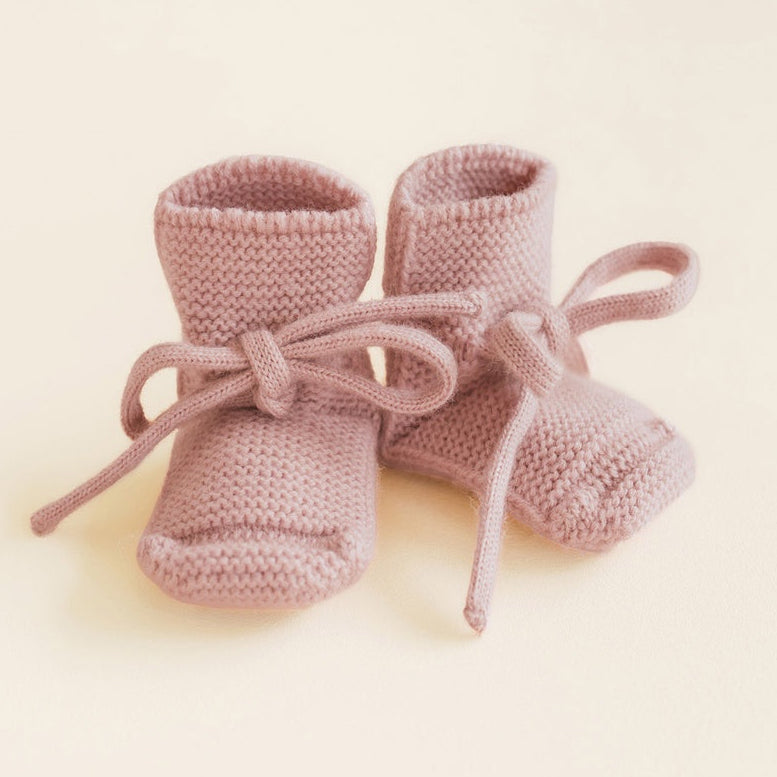 De babyslofjes zijn gebreid in 100% merino in ribbel knit samen zorgen zij voor extra elasticiteit en rekbaarheid zonder de vorm van de slofjes te verliezen. De baby booties hebben een echte hielvorm, dit zorgt voor een goede pasvorm. Ze blijven goed aan het voetje zitten door de gebreide veter die kan strikken.