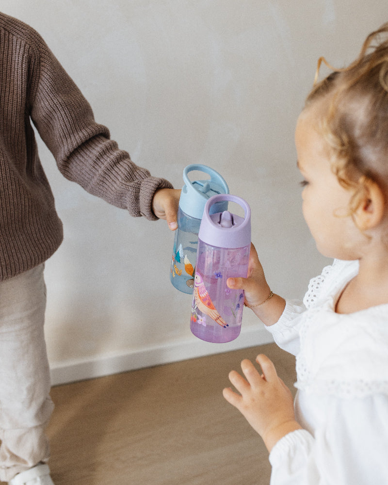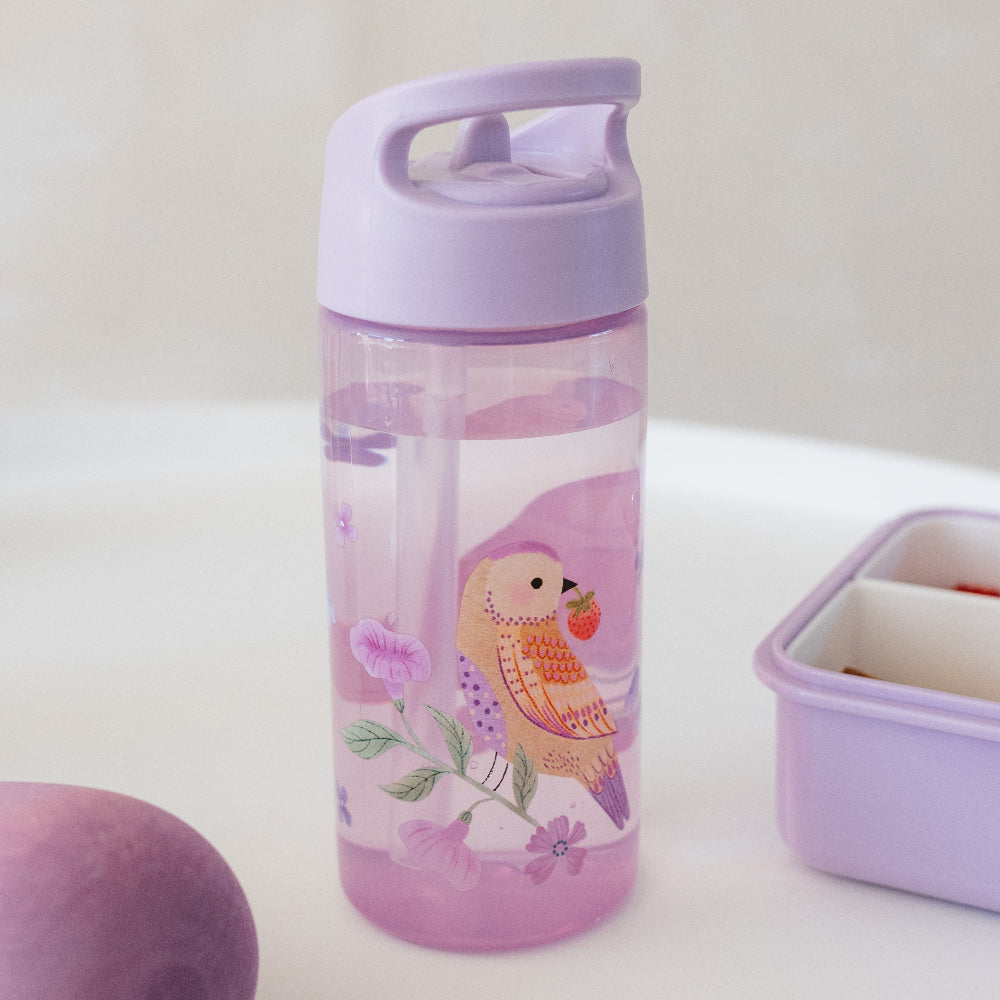 Petit Monkey drinkfles birds of a feather, een lekvrije drinkfles met rietje met prachtige vogels geïllustreerd door Rebecca Jones. De fles heeft een handige drinktuit die open en dicht geklapt kan worden.