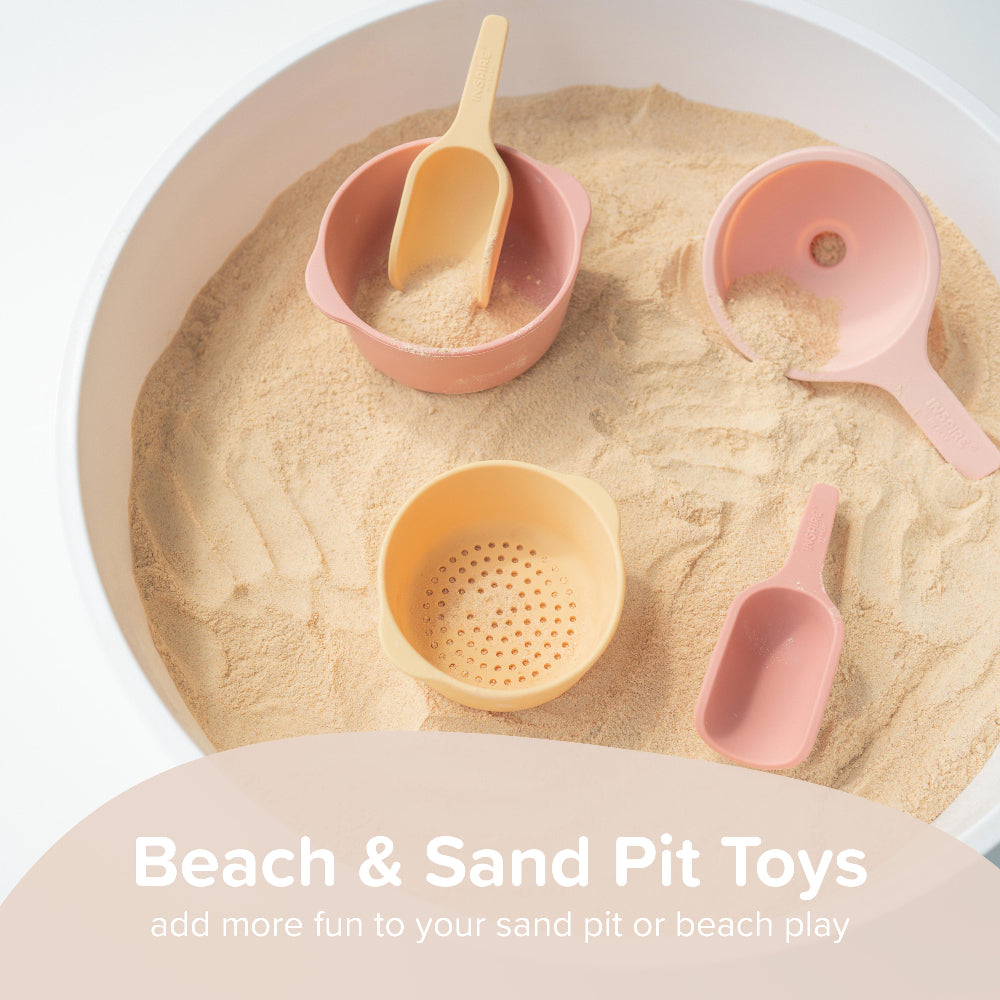 3 Inspire my Play bakjes voor de play TRAY, gebruik de koraal, roze en gele zeefjes en bakjes tijdens het spelen met waterkralen, kinetisch zand en speelrijst in jouw play TRAY schaal. Een mooie uitbreiding voor je sensory play, sensorisch speelgoed collectie.