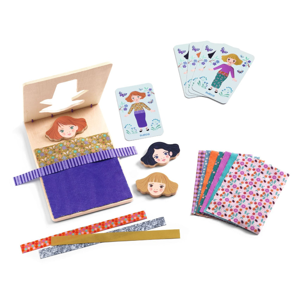 DJECO aankleedspel Zabichic bestaat uit 1 houten voetstuk, 3 houten hoofden, 9 stukken bedrukte stof, 4 bedrukte lintjes en 5 dubbelzijdig bedrukte voorbeeldkaarten. Urenlang speelplezier gegarandeerd!