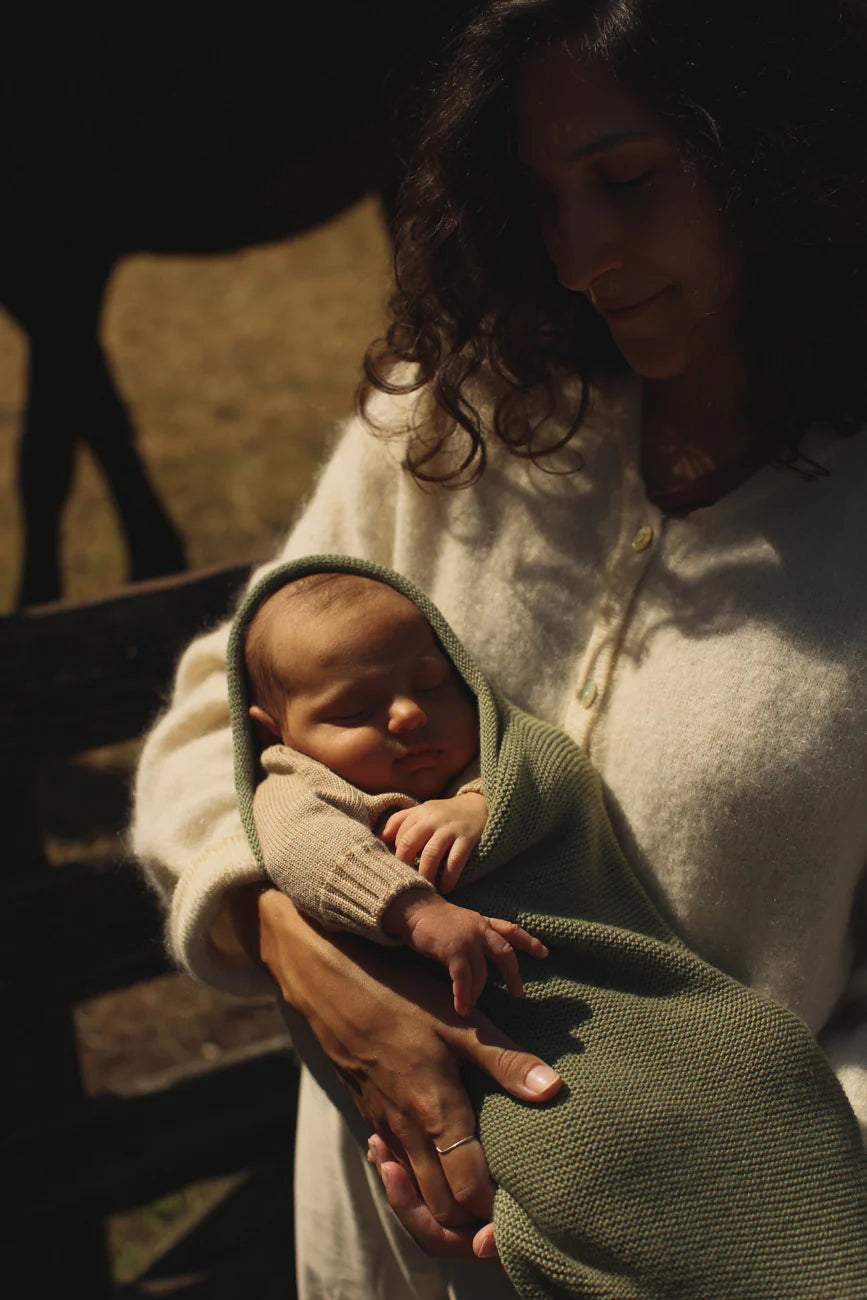De wollen cocoon is geschikt voor pasgeboren baby's van 0-8 maanden en gebreid in een ribbel knit deze zorgt voor extra elasticiteit en rekbaarheid zonder vormverlies van de cocoon.