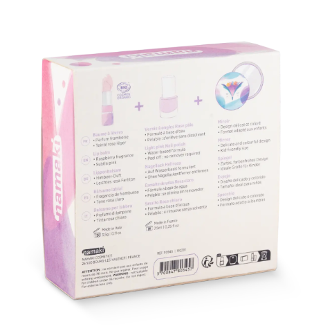De set bevat een frambozengeur lippenbalsem, subtiel lichtroze nagellak op waterbasis (geen nagellakremover nodig) en kinderspiegeltje in een charmant ontwerp.