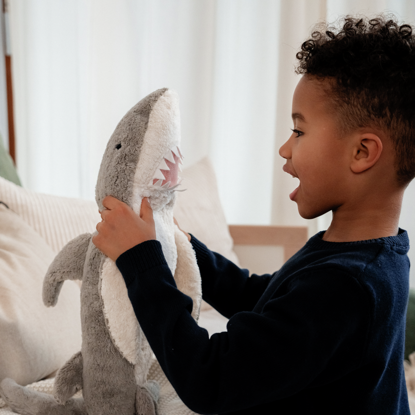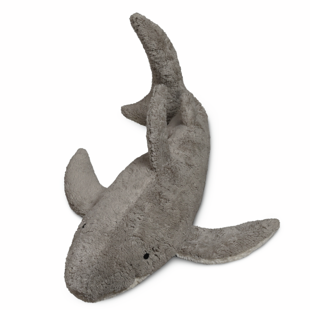 Grote warmteknuffel haai van Senger Naturwelt, een zachte knuffel voor jouw dreumes of kleuter of jezelf veilig om te gebruiken vanaf 2 maanden, veilig om mee te knuffelen, te slapen, te spelen en zelfs om in de mond te steken.